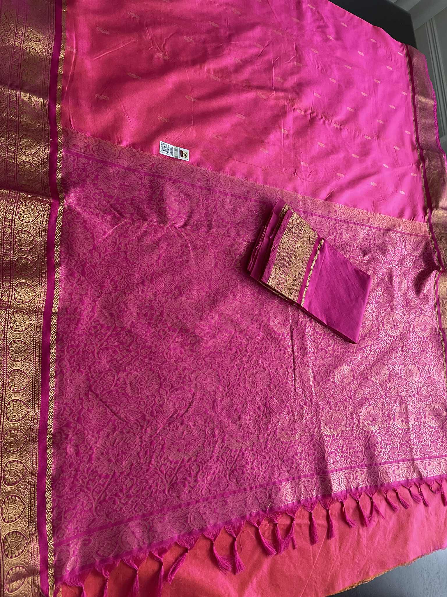 Handloom Kanchipuram Silk Saree with Jhalar Pallu, Gold Zari Weaving throughout Saree and Gold Zari Border. Unstitched Blouse Fabric. Silk Mark Certified.