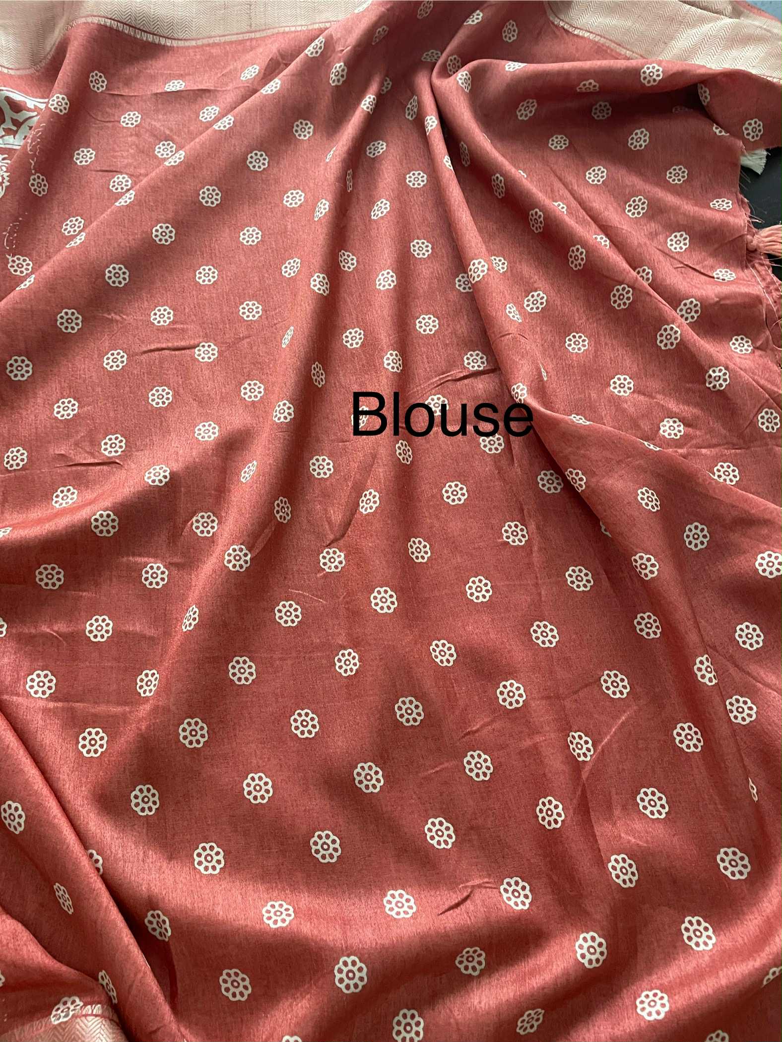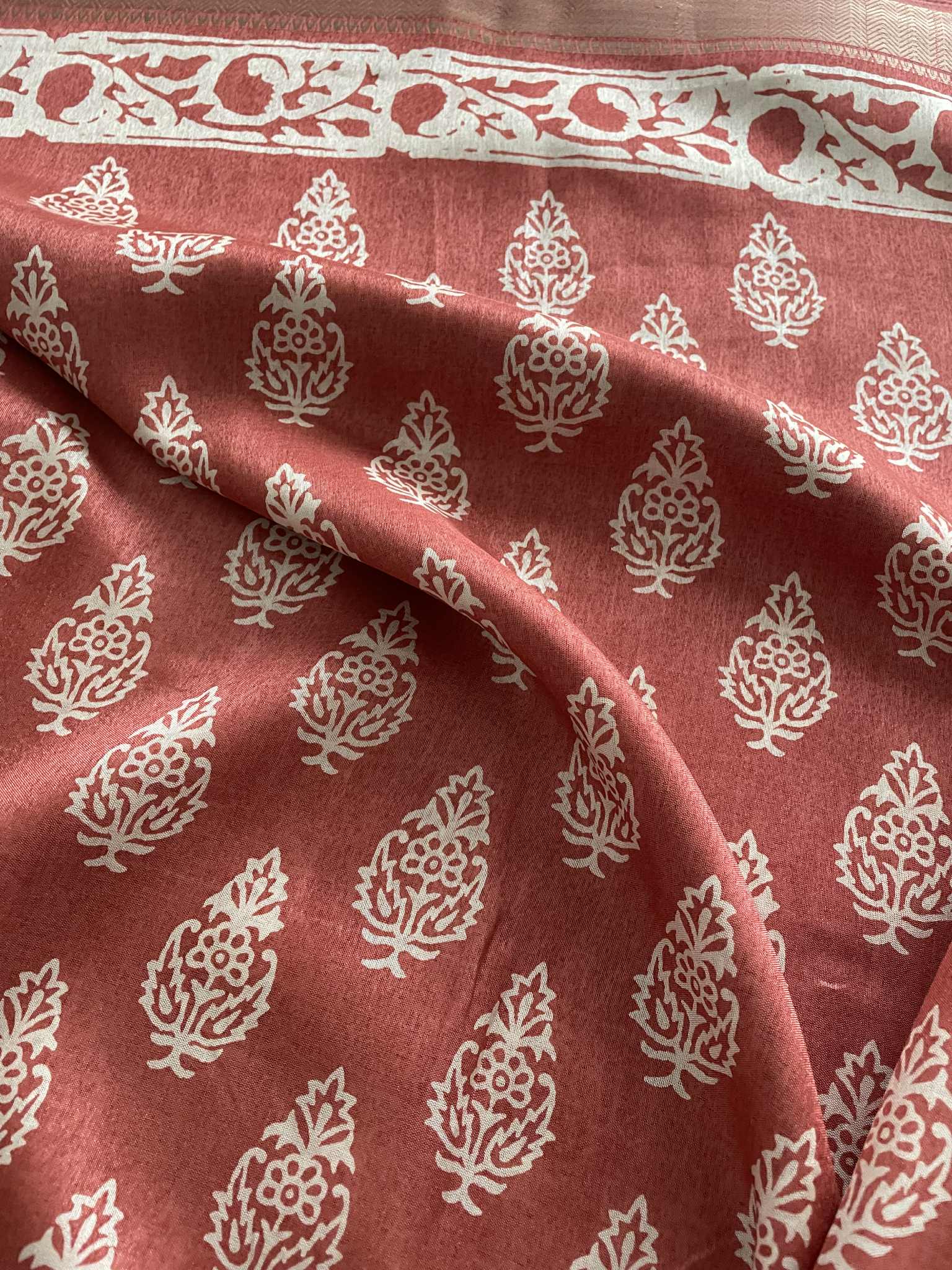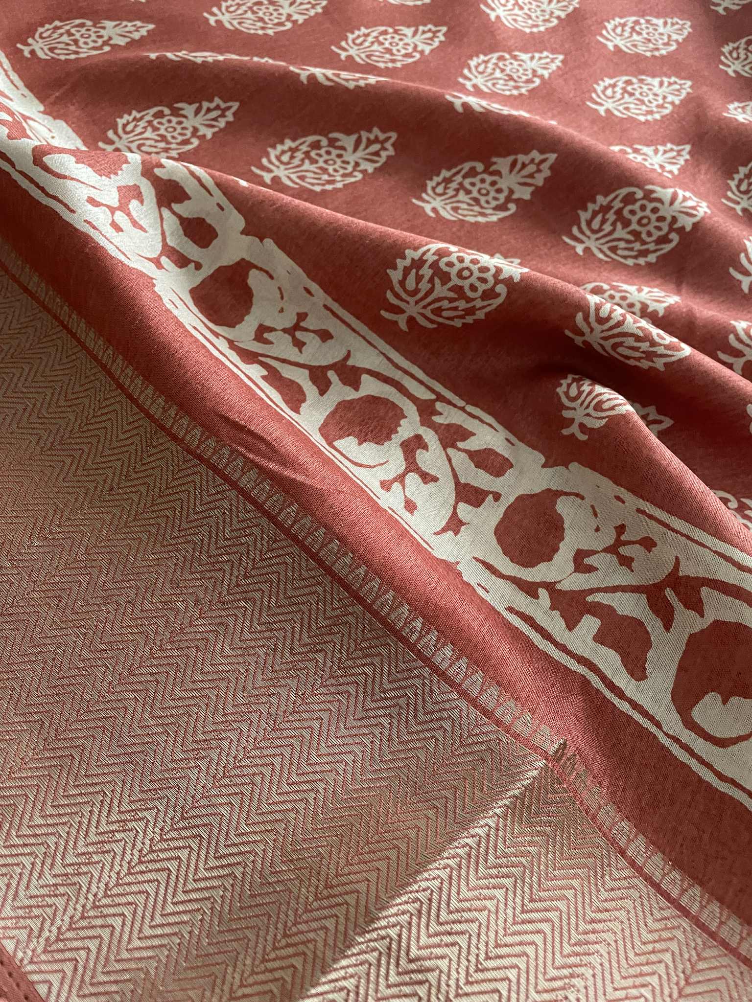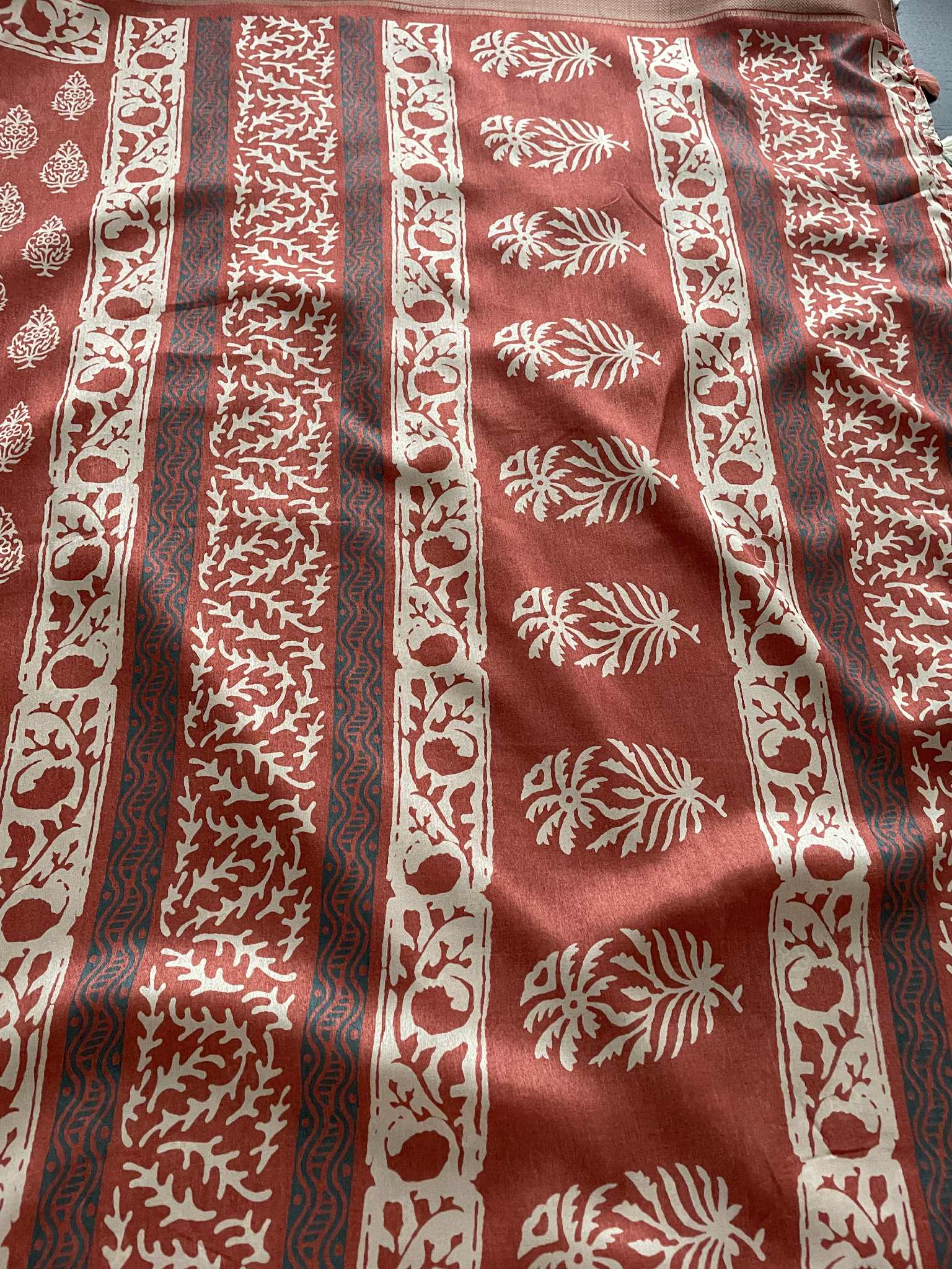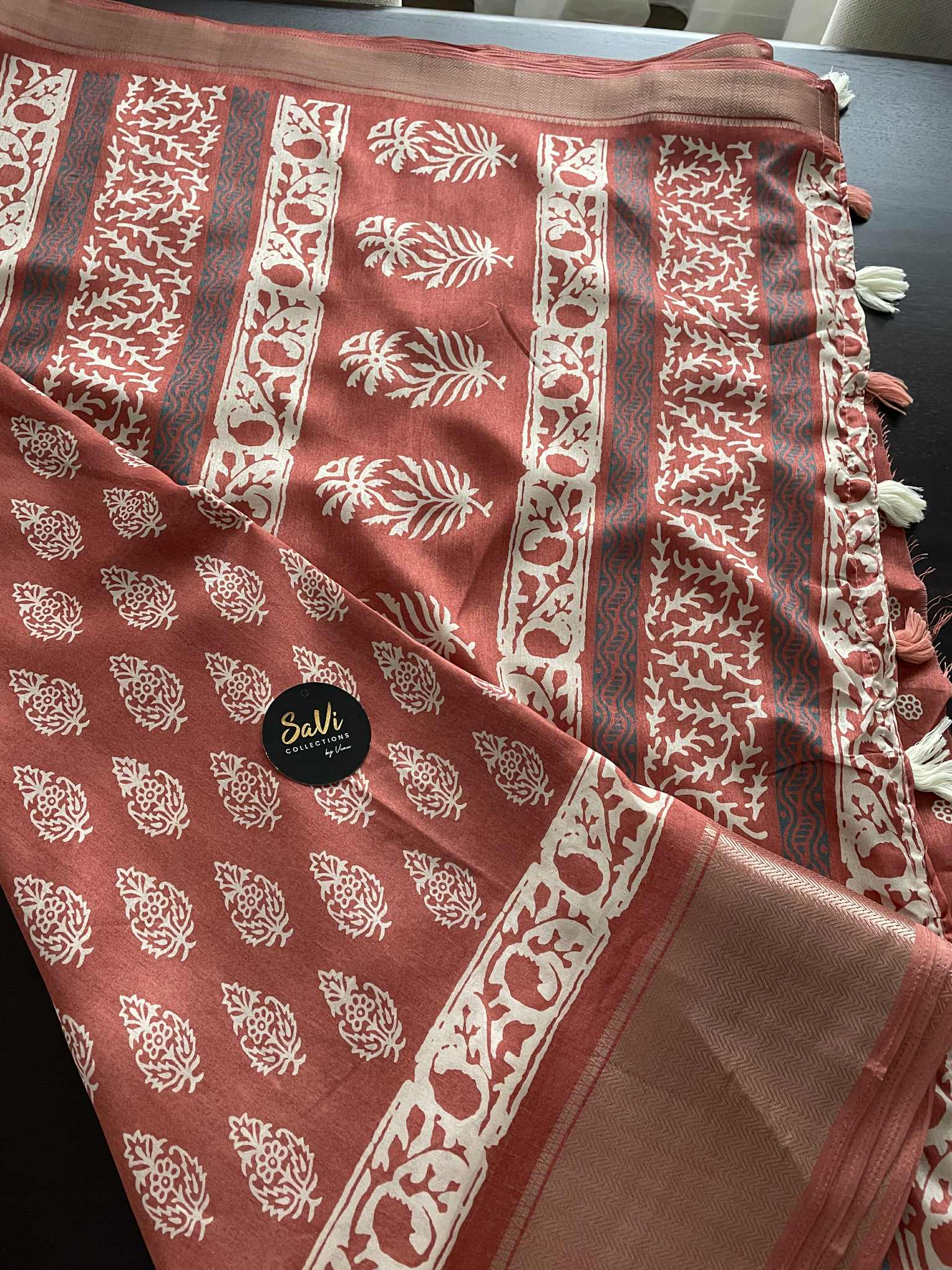 Soft Kalyani Silk blocked printed Saree with running blouse, jhalar pallu and gold zari border.