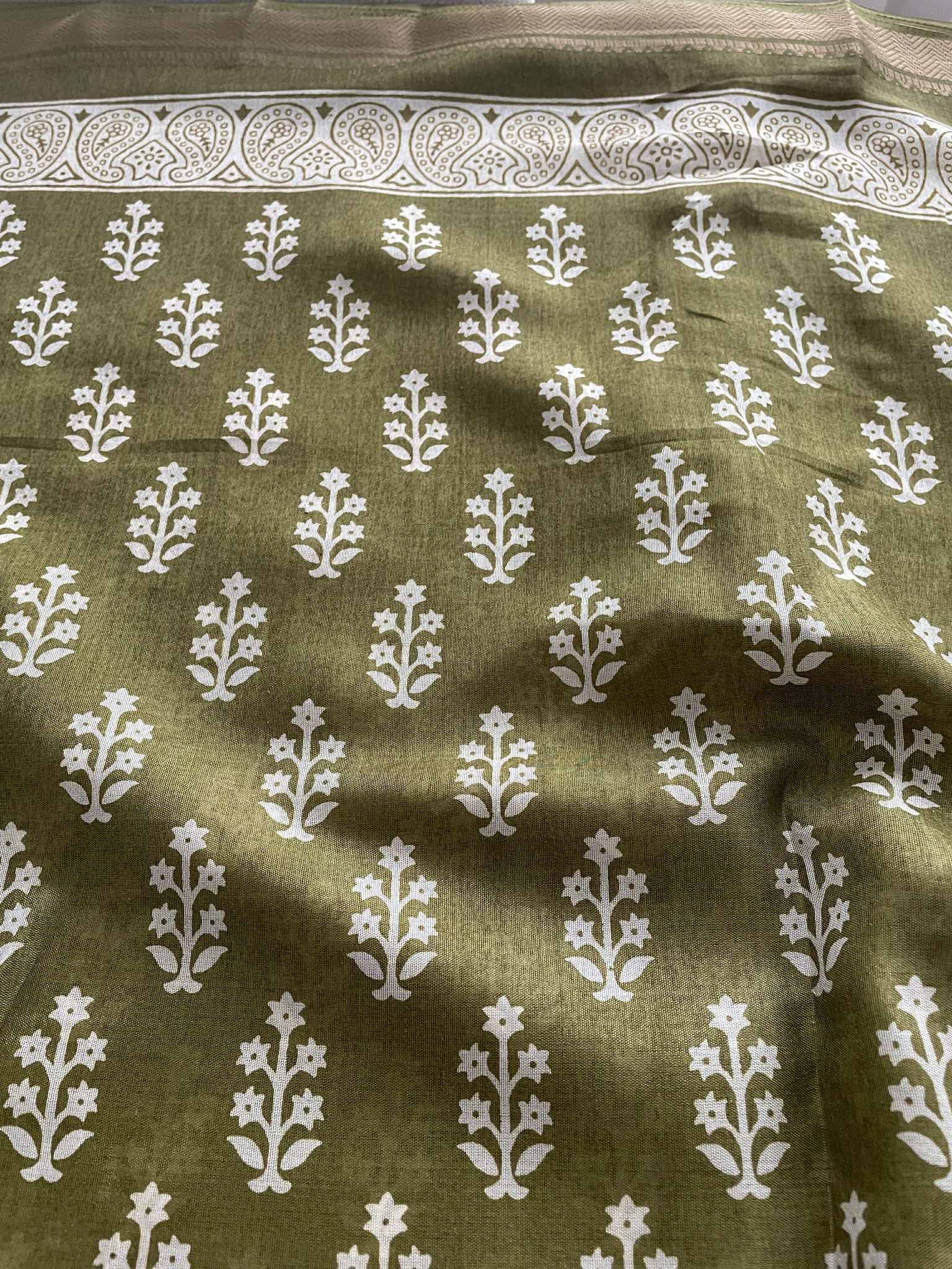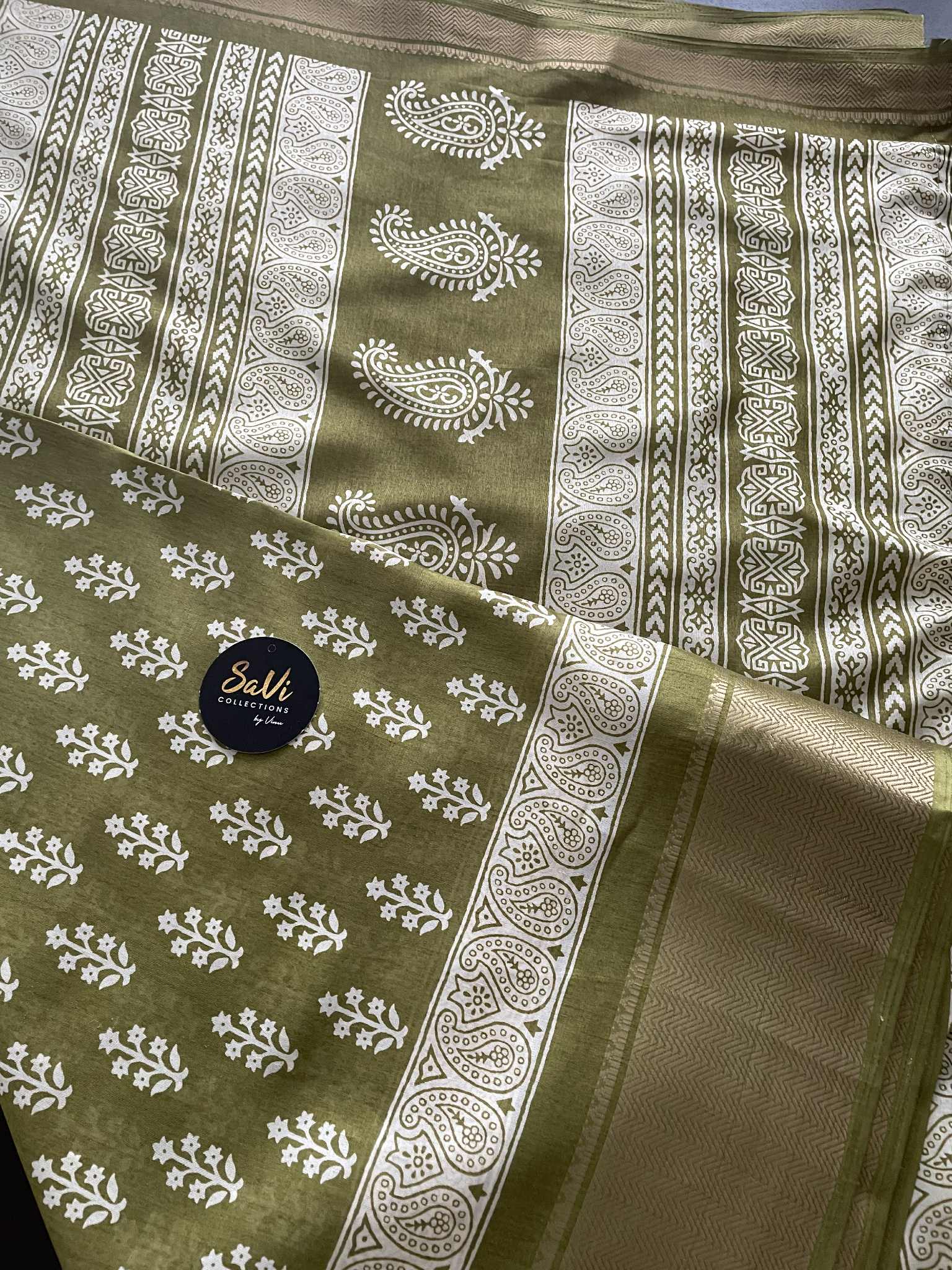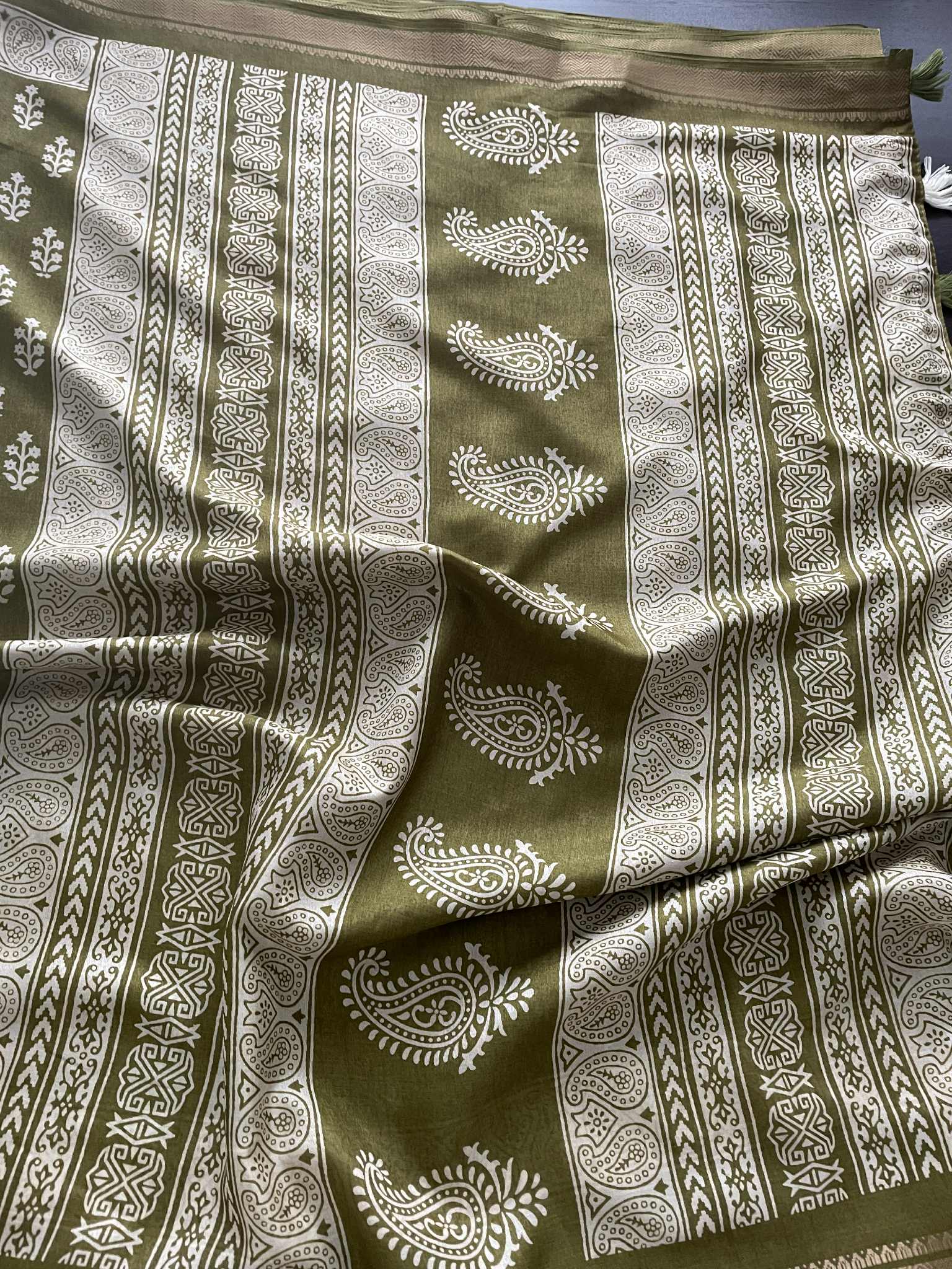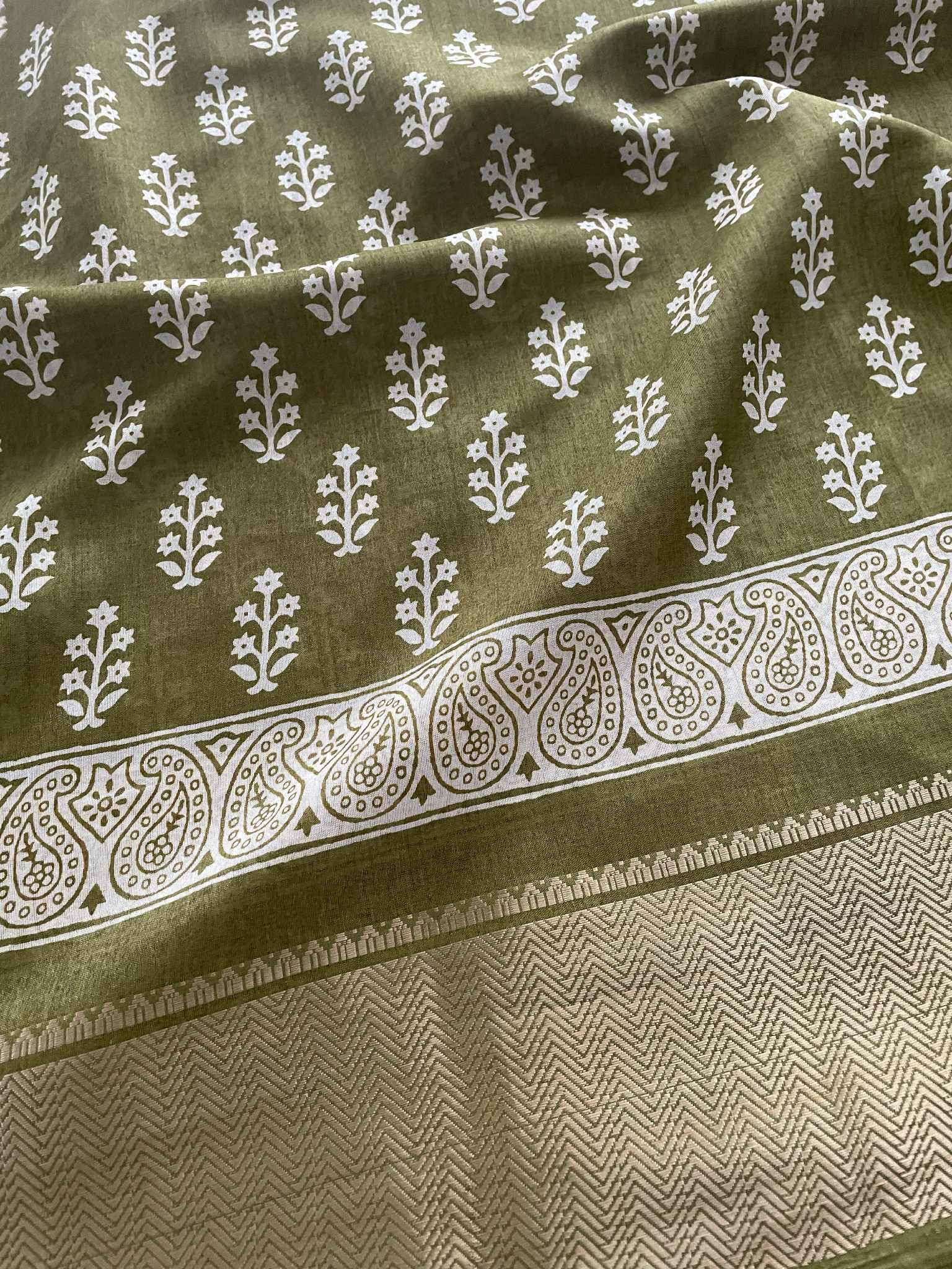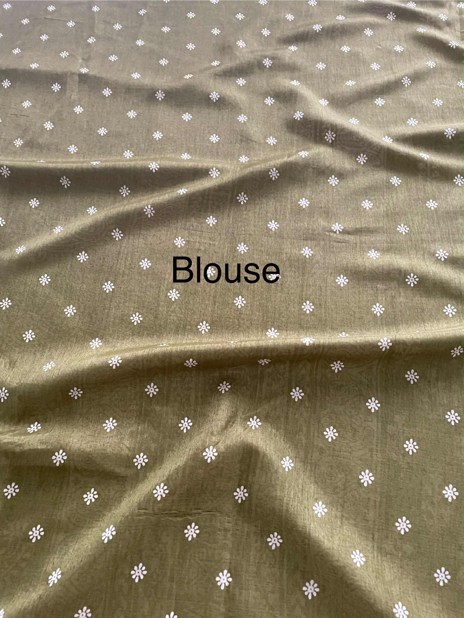 Soft Kalyani Silk blocked printed Saree with running blouse, jhalar pallu and gold zari border.
